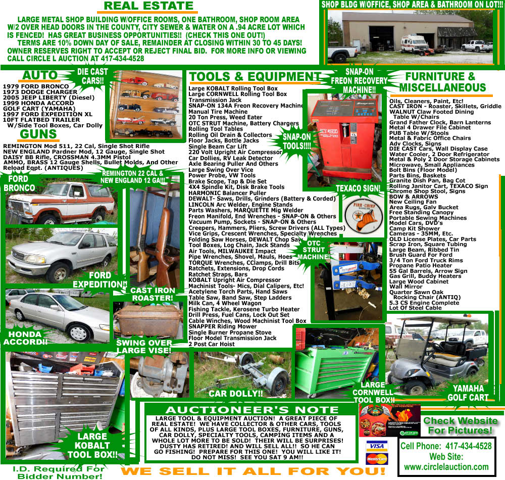 LARGE TOOL & EQUIPMENT AUCTION! A GREAT PIECE OF REAL ESTATE! WE HAVE COLLECTOR & OTHER CARS, TOOLS OF ALL KINDS, PLUS LARGE TOOL BOXES, FURNITURE, GUNS, CAR DOLLY, SPECIALTY TOOLS, CAMPING ITEMS AND A WHOLE LOT MORE TO BE SOLD!! LARGE CORNWELL AND ALSO LARGE KOBALT ROLLING TOOL BOXES!! SNAP-ON RECOVERY FREON MACHINE!! STRUT MACHINE!! FORD BRONCO, DODGE CHARGER, JEEP LIBERTY, HONDA ACCORD, FORD EXPEDITION, FLAT BED TRAILER, GOLF CART!!!!! SNAP-ON TOOLS!! LINCOLN ARC WELDER, TEXACO SIGN, DIE CAST CARS, CAST IRON, ANTIQUES & COLLECTABLES!!!! THERE WILL BE SOME SURPRISES! DUSTY HAS RETIRED! AND WILL SELL ALL!! SO HE CAN GO FISHING!! PREPARE FOR THIS ONE!!
