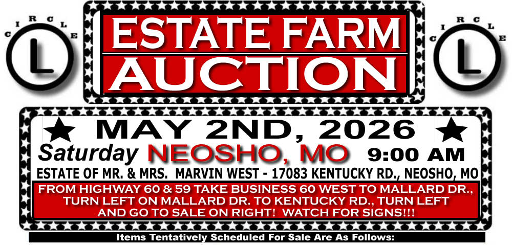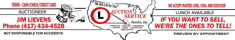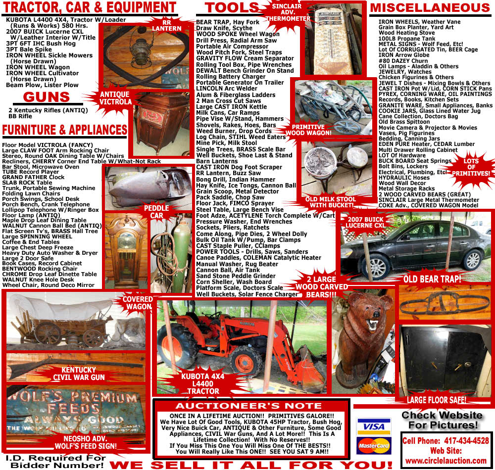 ONCE IN A LIFETIME AUCTION!! PRIMITIVES GALORE!! WE HAVE A LOT OF GOOD TOOLS, KUBOTA 45HP TRACTOR, BUSH HOG, VERY NICE BUICK CAR, ANTIQUE & OTHER FURNITURE, SOME GOOD APPLIANCES, CIVIL WAR GUNS, ANTIQUE VICTROLA, BEAR TRAP, LARGE FLOOR SAFE, NEOSHO ADV. WOLFS FEED SIGN AND A LOT MORE!! THIS IS A LIFETIME COLLECTION! WITH NO RESERVES!! YOU WILL REALLY LIKE THIS ONE!! SEE YOU SAT 9 AM!!